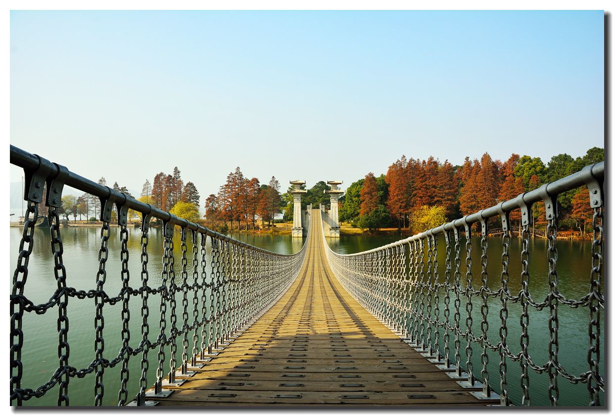 木制吊橋又稱懸索橋,由懸索,橋塔,吊桿,錨錠,加勁梁及橋面系所組成。
